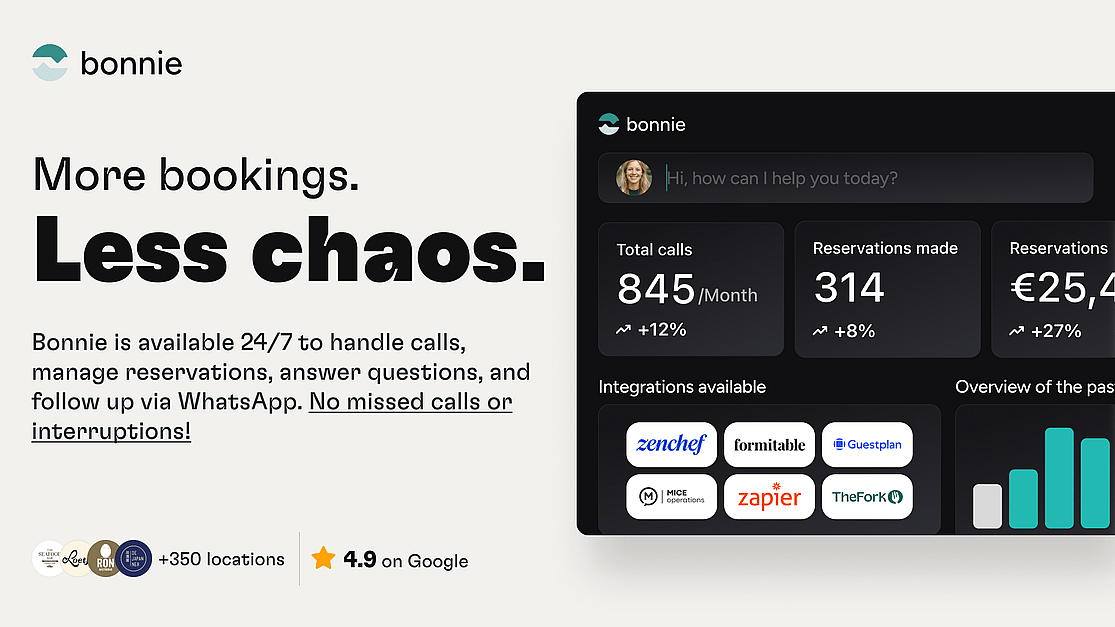 Bonnie is het AI-gastcontactplatform voor restaurants. Het automatiseert alle interacties vóór het bezoek, van telefoontjes en reserveringen tot veelgestelde vragen en WhatsApp-follow-ups. Bonnie voorkomt gemiste reserveringen, verlaagt kosten en geeft teams de ruimte om zich te focussen op gasten in de zaak. Met de visie om de volledige gastreis (voor- en na bezoek) te ondersteunen bouwt Bonnie aan de always-on AI-gastcontactplatform voor de hospitalitysector.