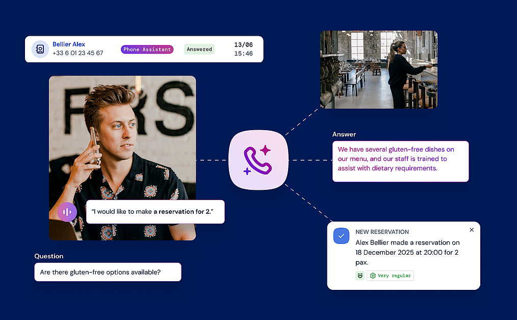 The Zenchef AI Phone Assistant is an AI-powered voice assistant for restaurants, capable of natural conversations. It uses a Large Language Model (LLM) to handle calls, check availability, record reservations, and send confirmations. Every interaction enriches its knowledge base, enabling continuous learning and improved responses. By automating repetitive tasks, it optimizes operations, enhances customer experience, and supports sustainable, data-driven workflows.